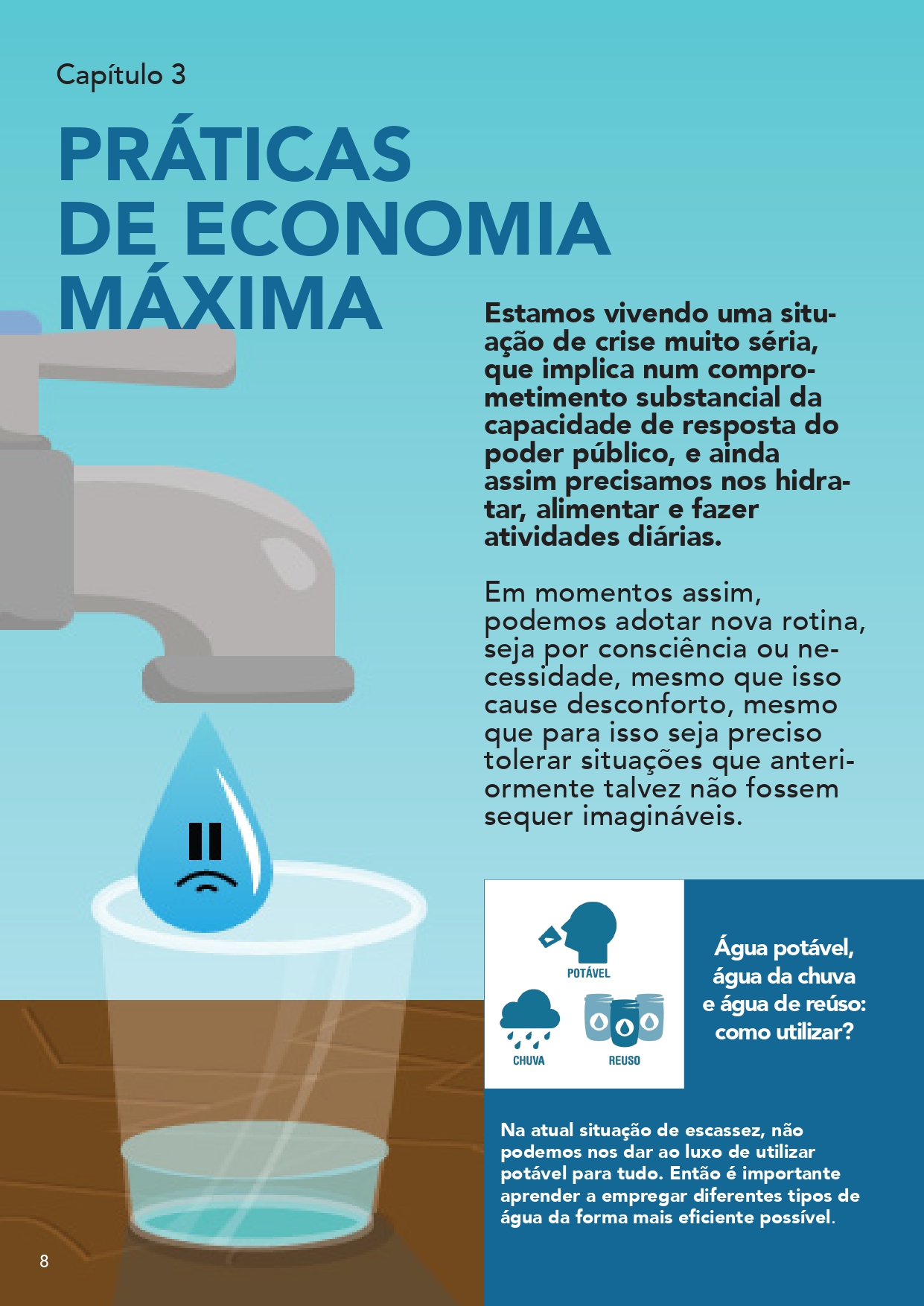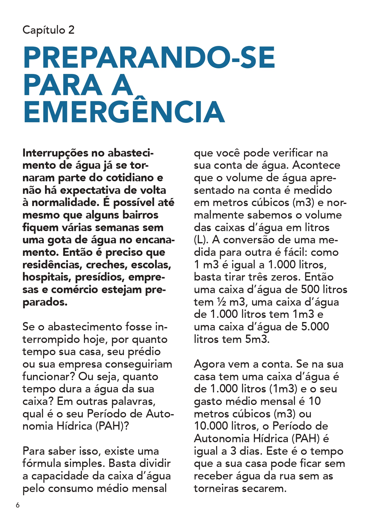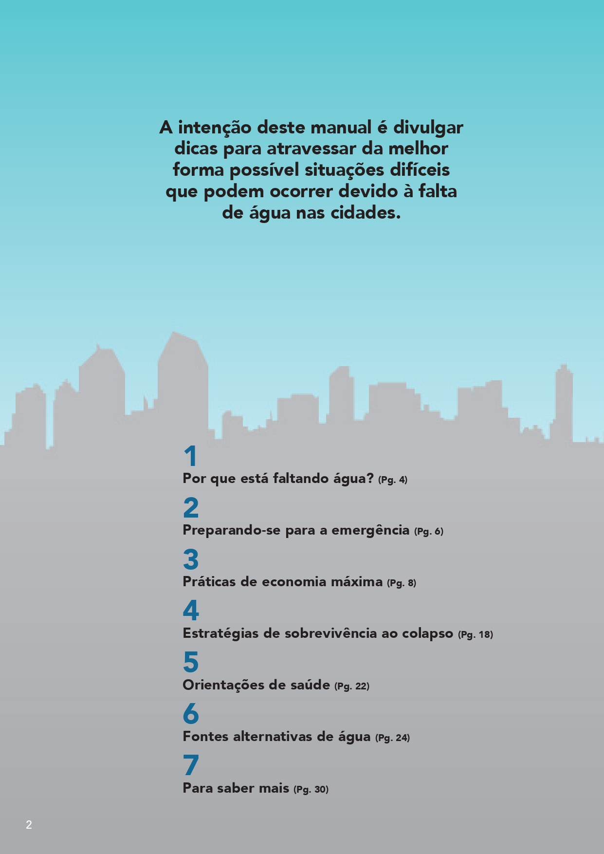 No auge da Crise Hídrica de 2015, este material da Aliança pela Água reuniu dicas para atravessar da melhor forma possível situações difíceis que podem ocorrer devido à falta de água nas cidades. Segundo a apresentação, o manual é um chamado para a mudança de hábitos: aprender e aplicar novas práticas e sobretudo adotar um estilo de vida realmente sustentável em casa, no emprego, na escola e na comunidade, individual e coletivamente.