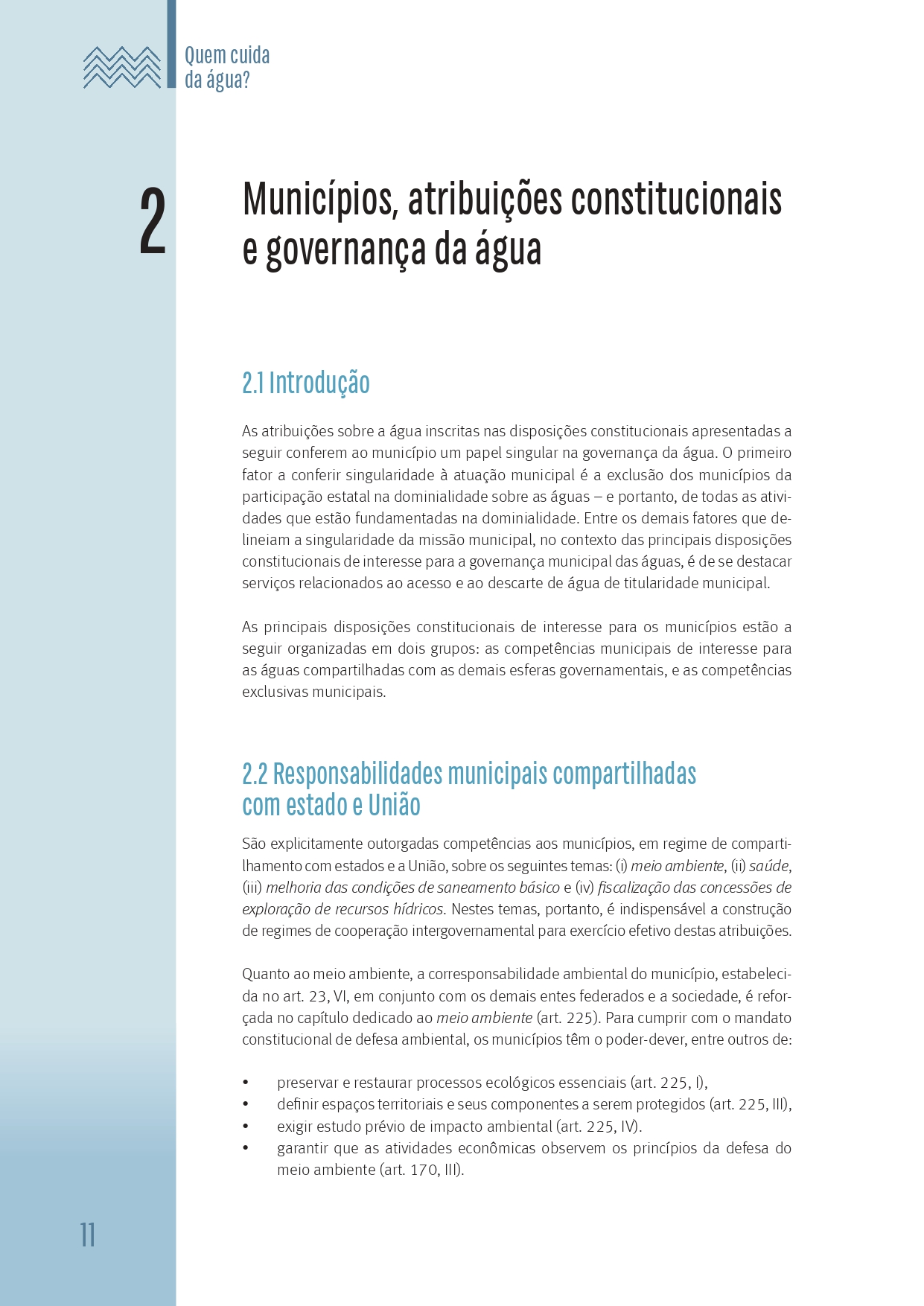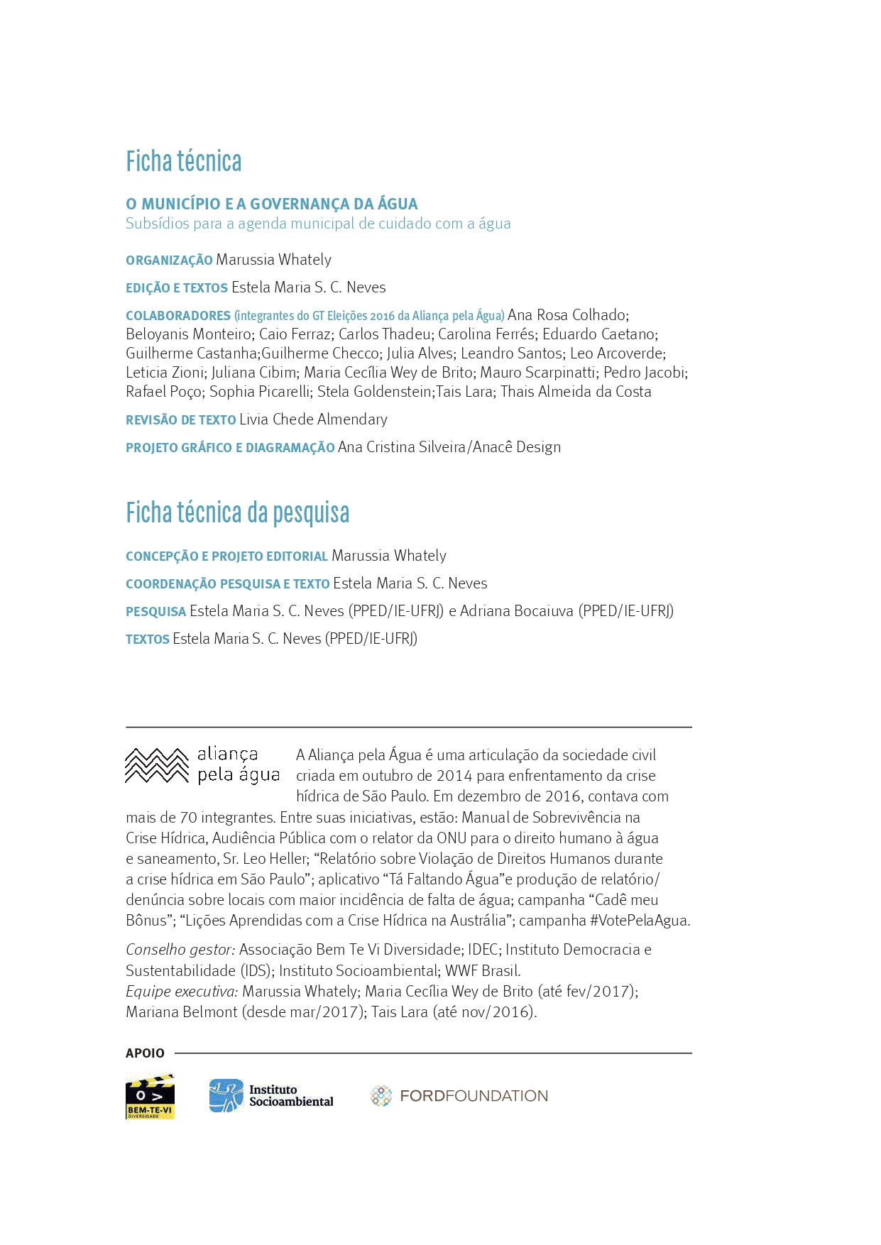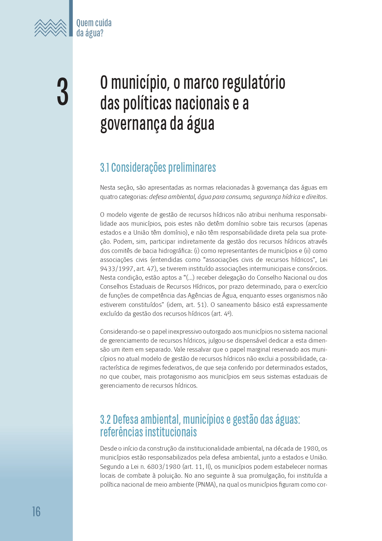 Documento de 2016 com subsídios para uma agenda municipal de cuidado com a água. O trabalho analisa o papel do município na governança das águas doces, contribuindo para a identificação de responsabilidades e possibilidades de ação dos governos locais em relação a esses recursos, e de linhas de políticas públicas que respondam às atribuições municipais nesse campo.
