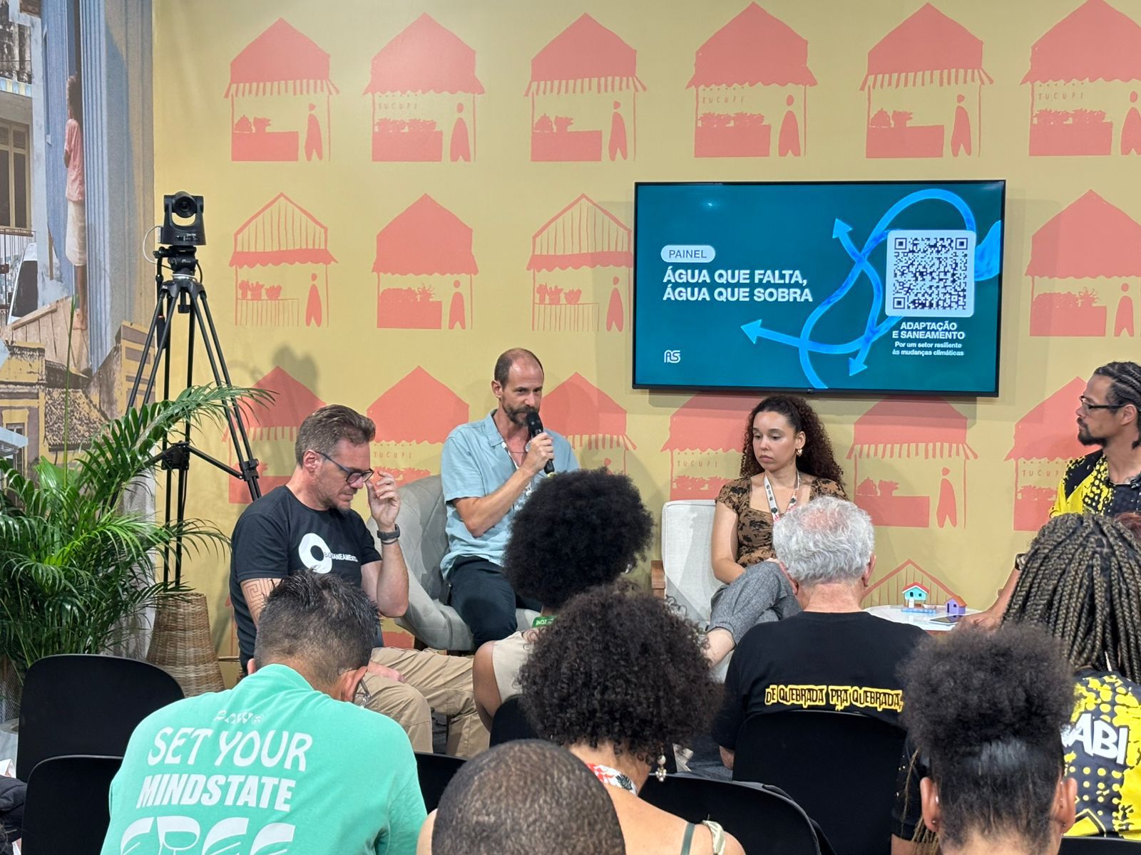 Dia 18, foi a vez de Eduardo Caetano conduzir o painel “Água que sobra, água que falta – Desafios e Soluções para o Saneamento Resiliente” (foto acima), organizado pelo próprio IAS no espaço da CAU (Conselho de Arquitetura e Urbanismo). Na conversa estavam Luiz Fazio, presidente da Biosaneamento, Everton da Silva Oliveira, da Ciclolog, e Malu Barbosa, do Ressuscita São Gonçalo.