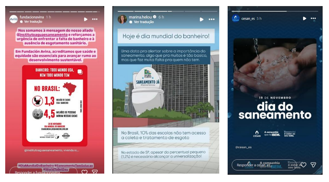 Em seus perfis no Instagram, Linkedin e Facebook, o IAS também publicou posts com informações sobre a data e sua importância para a conscientização em relação às lacunas do saneamento básico no país, da falta de coleta de esgoto à ausência de banheiros em residências.